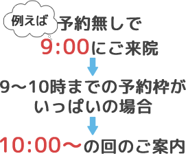 例えば、予約無しで9:00にご来院いただいた際に、9~10時までの予約枠がいっぱいの場合は、10:00~の回のご案内となります。